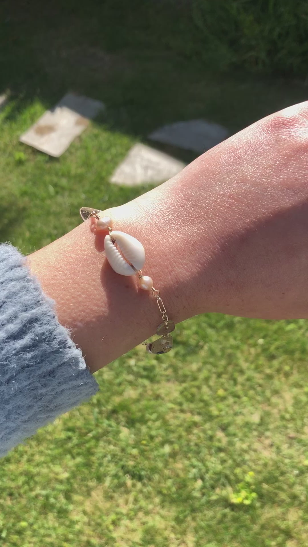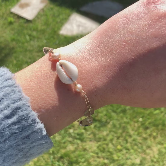 Embrace coastal elegance with our One-of-a-Kind Cowrie Shell, Pearl, and Rutilated Quartz Gold-Filled Bracelet. This exquisite piece features a unique combination of a genuine cowrie shell, lustrous pearls, and shimmering rutilated quartz, all beautifully crafted with high-quality gold-filled materials.