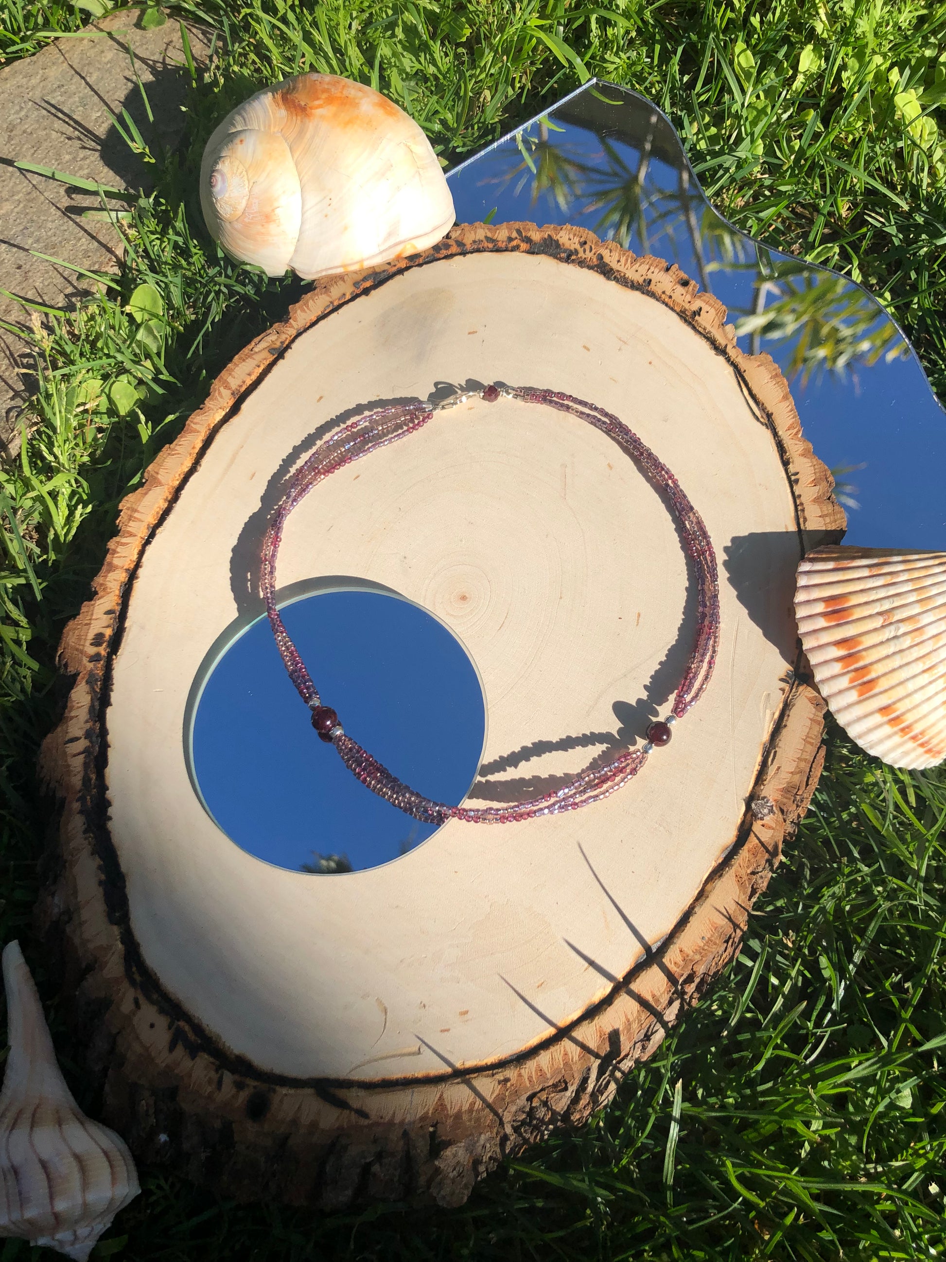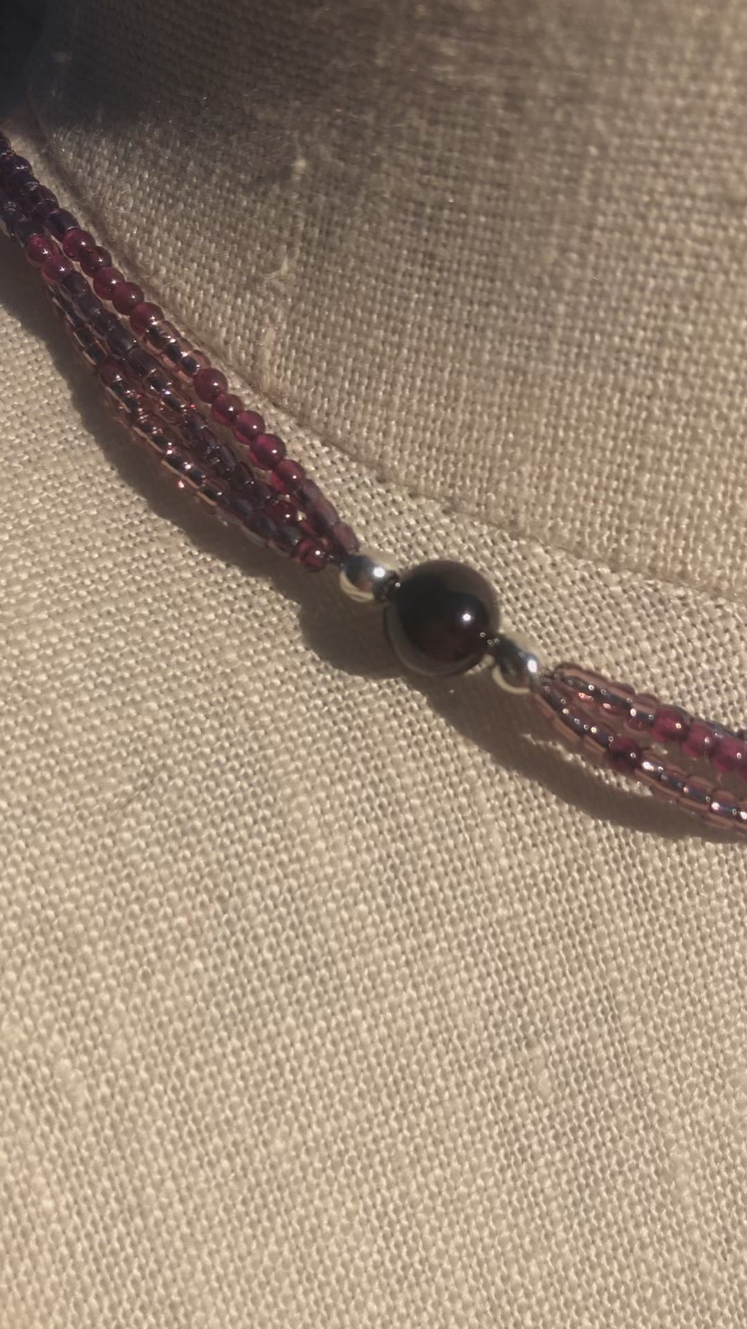 Garnet is believed to inspire love and devotion, as well as promote emotional balance. Paired with the enchanting purple glass beads, this necklace is not just a fashion accessory but also a meaningful addition to your collection.